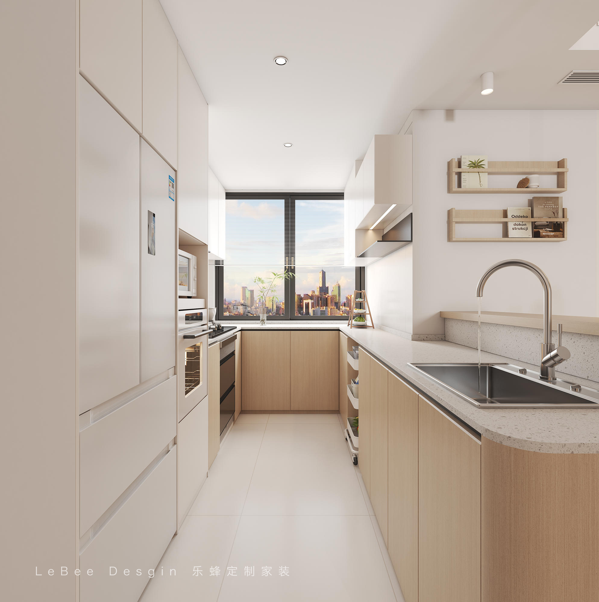 - 廚房效果圖 - 6㎡的廚房采用開放式設計,半高隔斷搭配開扇窗,讓整個公共區域更加通透,自然串聯。