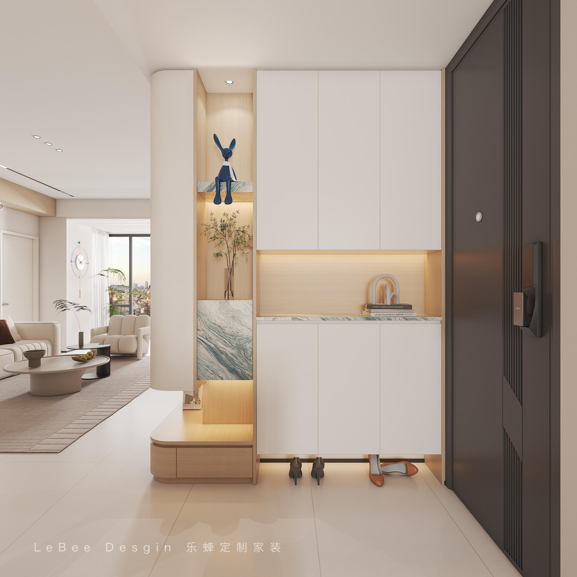 - 入戶整體暖色調的搭配,定制換鞋柜,開放格的設計連接電視機背景墻做弧形轉角的設計,開放格則內嵌燈帶+大理石巖板點綴,白+原木色的點綴讓整個空間更加舒適。