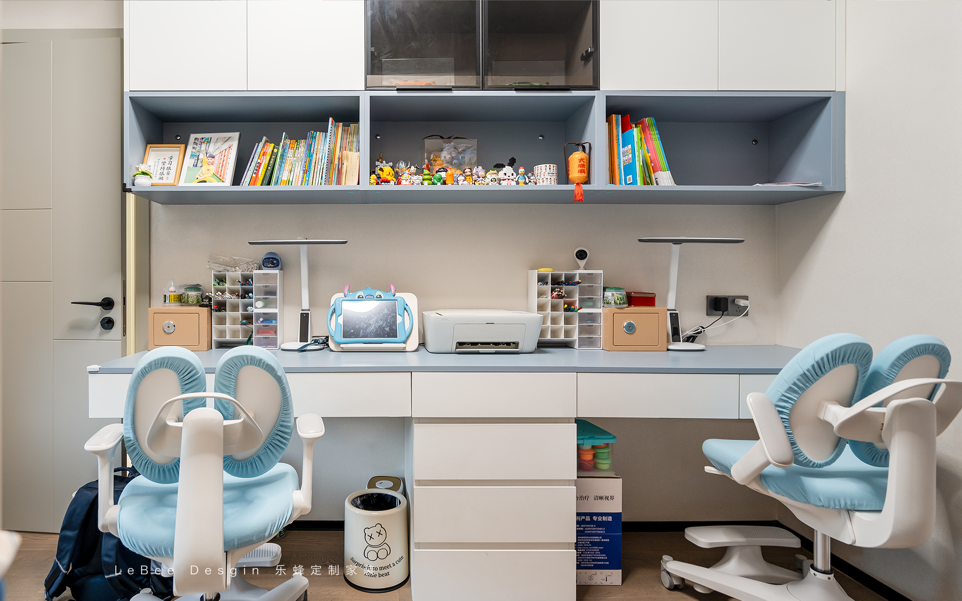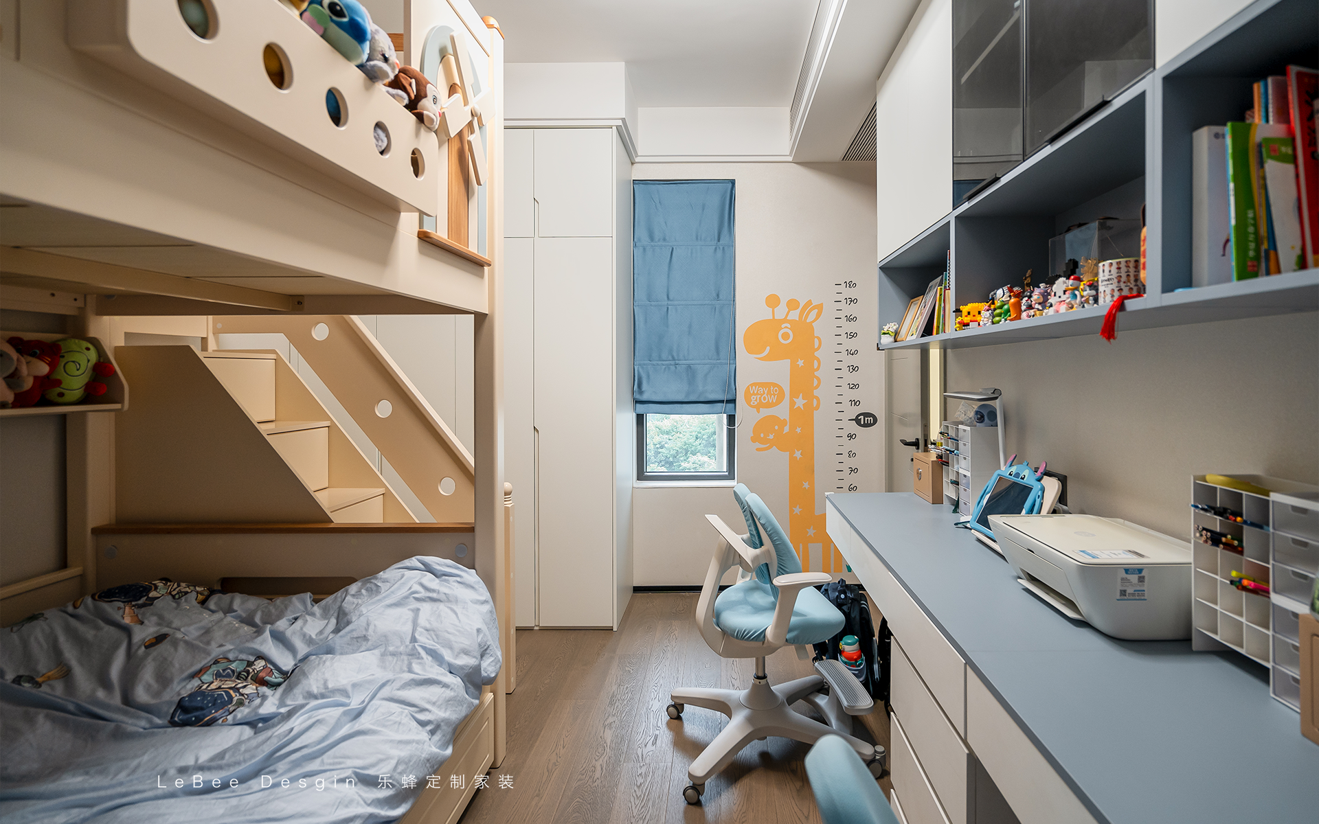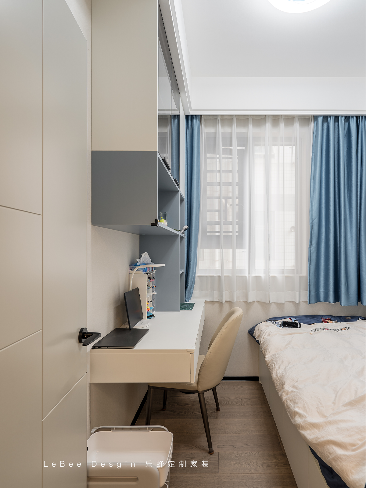 兒童房二的房間面積偏小,選擇定制家具收納,直接實現空間最大化利用!懸浮書桌+開放格設計,擴展收納,讓小空間裝出大功能!
