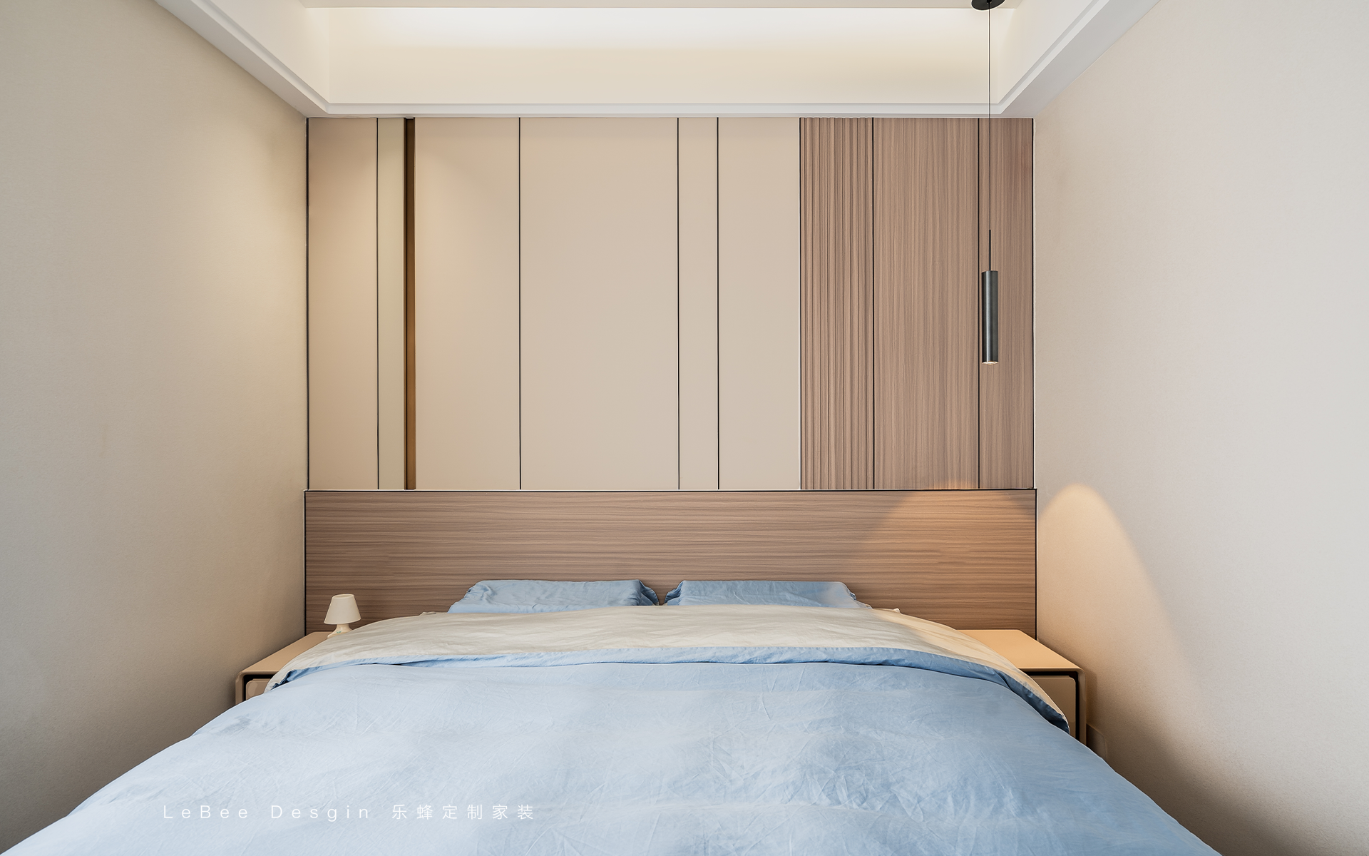 主臥溫馨簡約,采用無主燈設計,床頭靠背設計淺色木飾面+木格柵拼接,加上床頭吊燈制造溫暖的氛圍~以簡約自然本質打造極簡的生活空間!