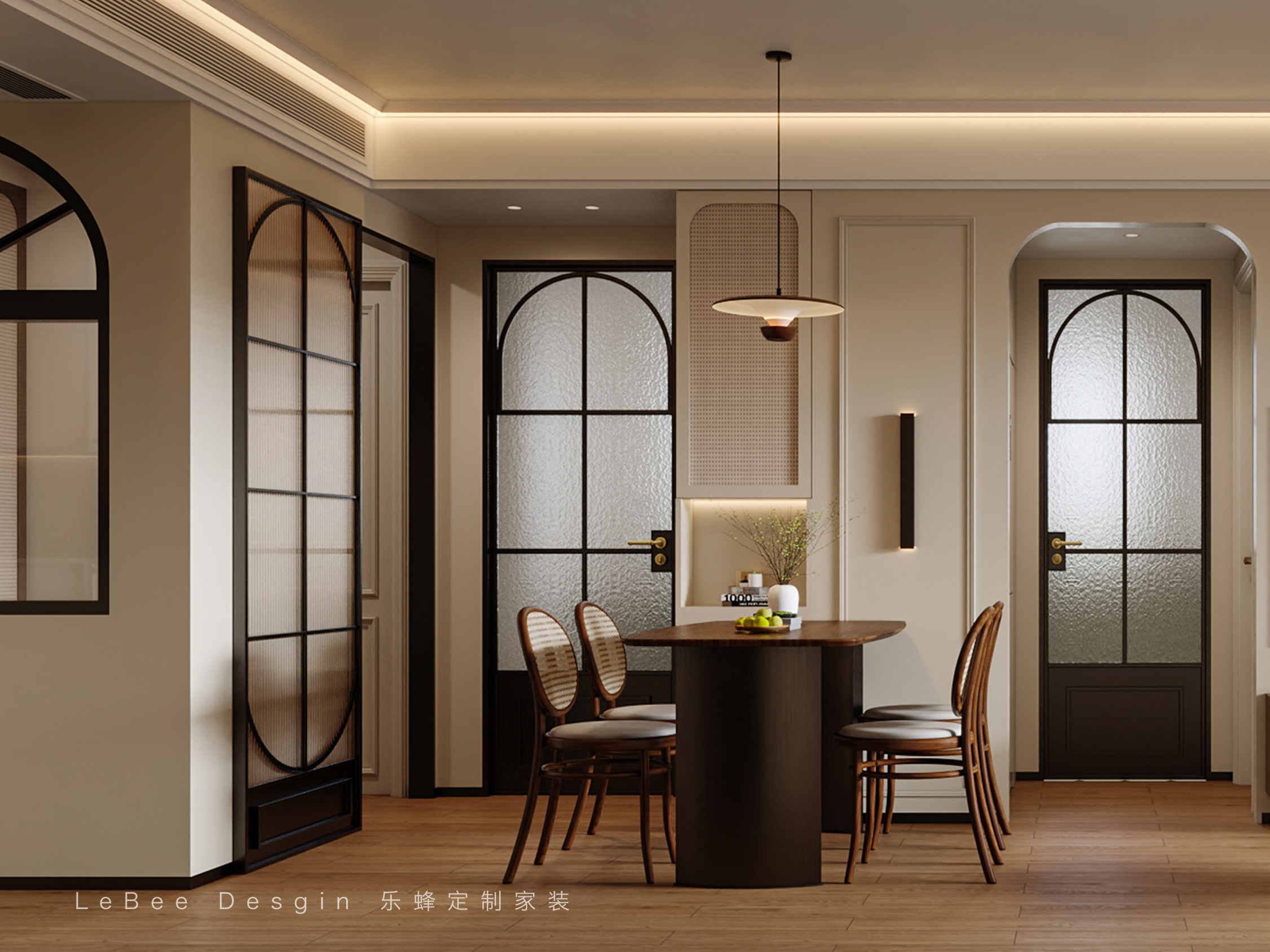 餐桌復古銅吊燈增添氛圍,在光影的交疊下,帶來濃濃的煙火氣息。法式弧形門完美劃分廚房區域,同色系餐邊柜靠墻擺放,增加收納區。
