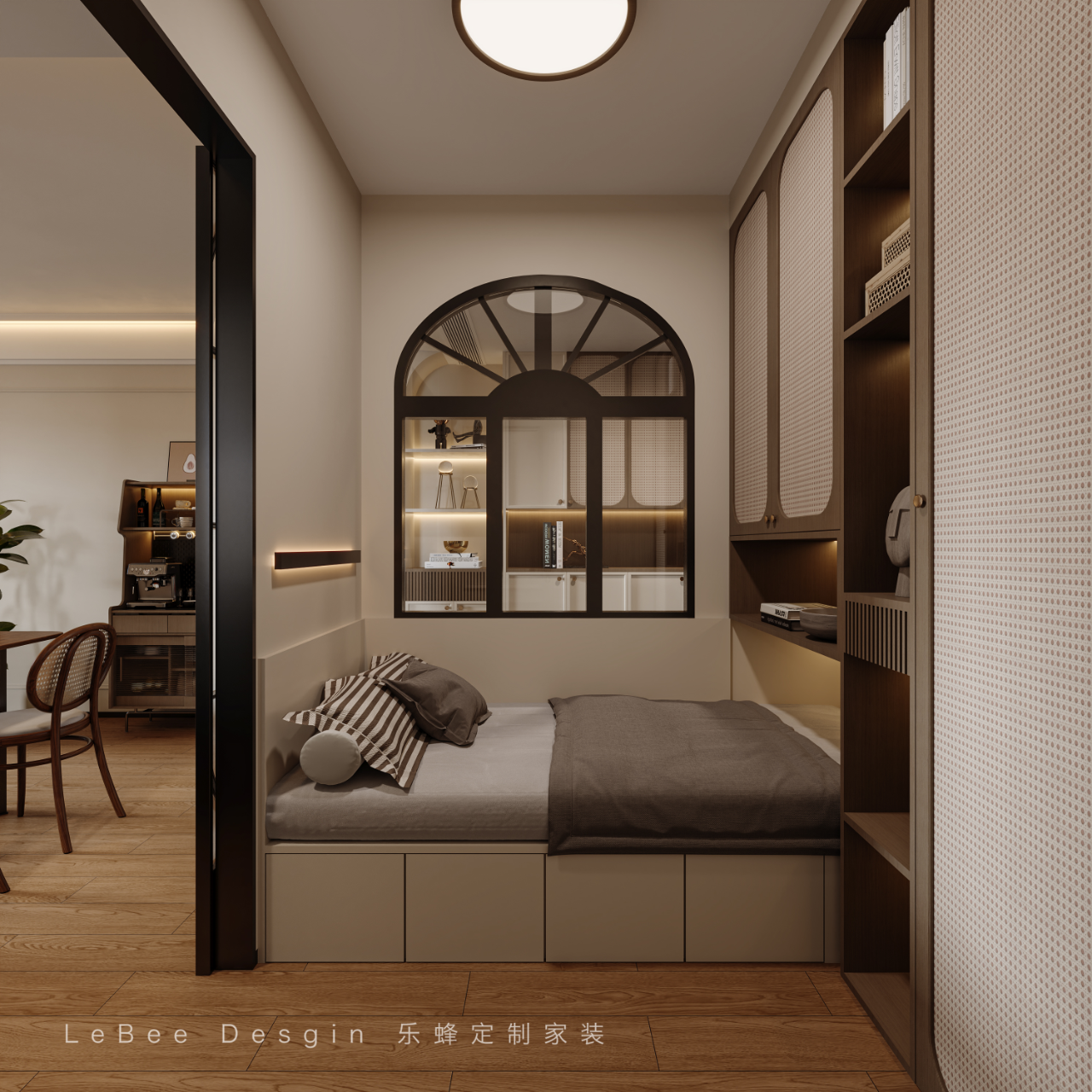 - 兒童房效果圖 - 原臥室空間重新布局為兒童房。入墻式移門,占地面積0㎡,自由開合,安全可靠。半墻隔斷搭配格子拱形窗,get 通透采光。