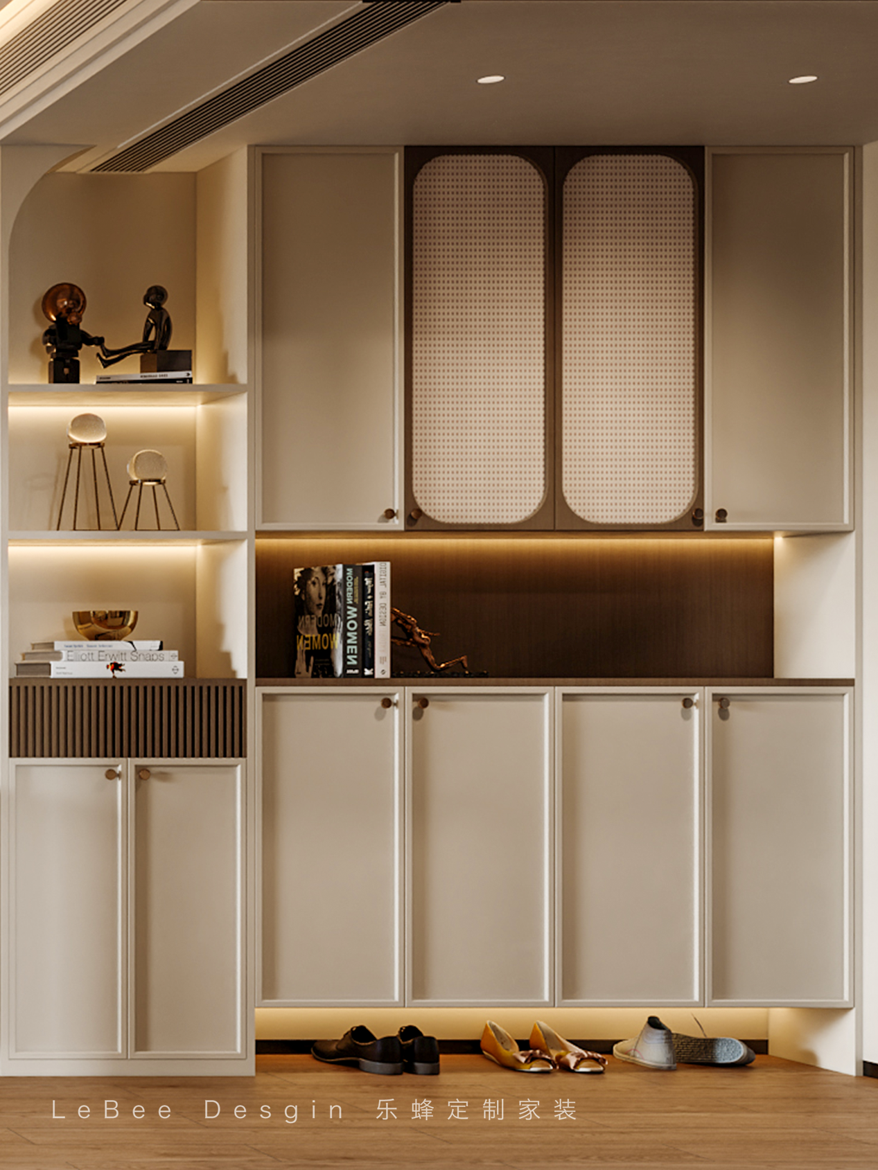 - 氛圍感直接拉滿的通體收納柜,令人一眼心動。奶油白與藤編、弧形元素巧妙結合,營造出柔美、輕盈且高雅的入戶體驗。