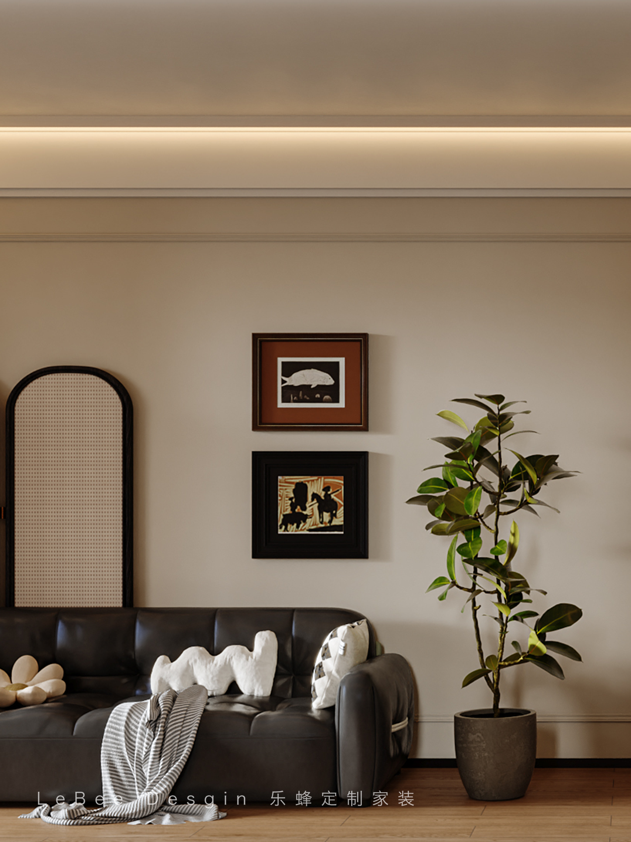 搭配 pu 線條和精致的角花,法式韻味悄然流露。柔軟的面包形狀沙發、胡桃木茶幾和黑白方塊羊毛毯,讓整個空間更加溫馨。