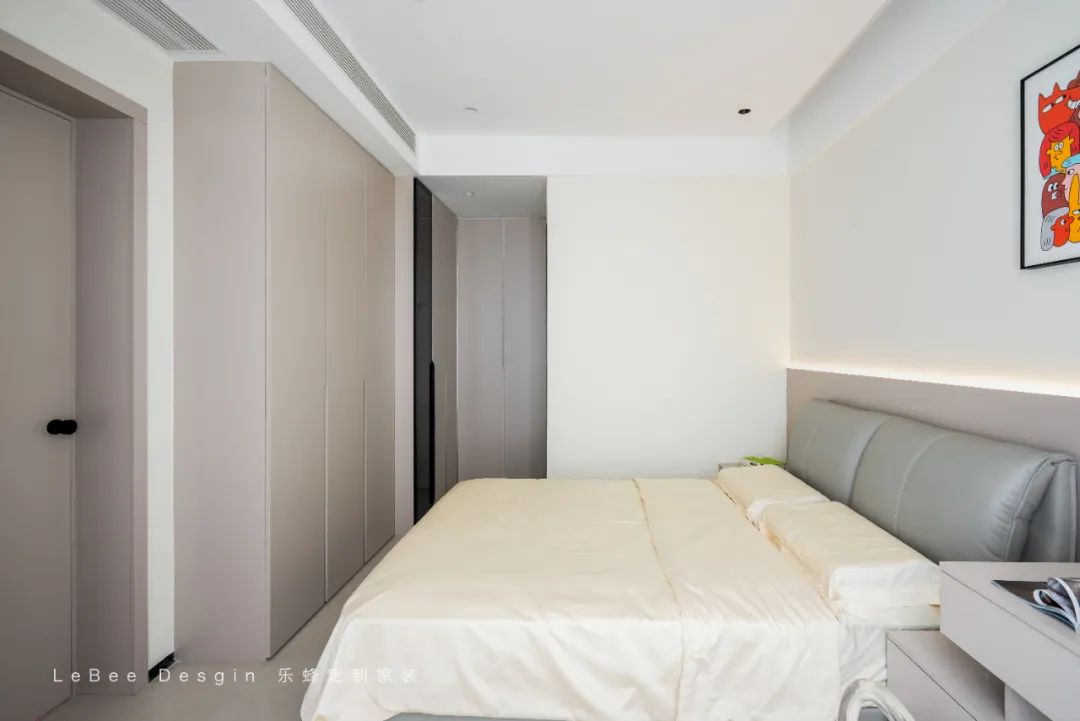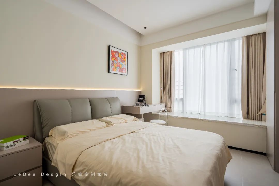 - 主臥實景圖 - 主臥墻面整體涂刷低飽和度淺色系乳膠漆,柔和色調營造靜謐氛圍,同時與室外綠植景觀形成自然呼應。