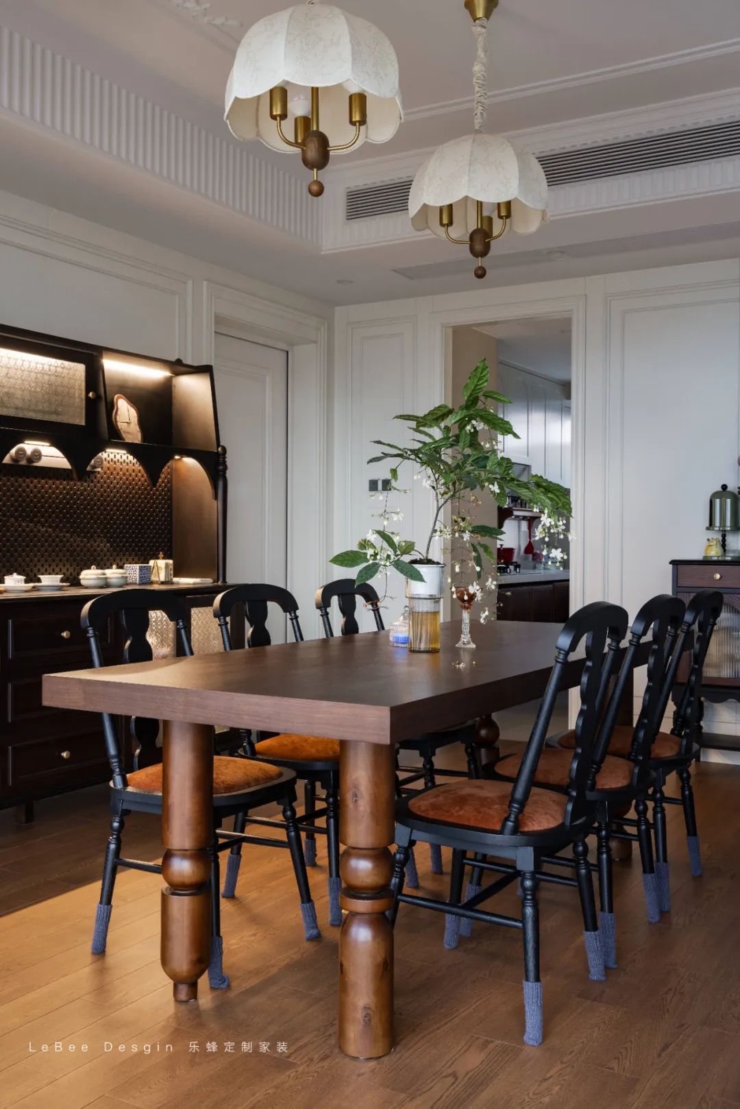 復古餐桌椅CP:1.6米胡桃木長桌+復古椅,上方懸掛包豪斯玻璃吊燈,用餐瞬間變身藝術現場。