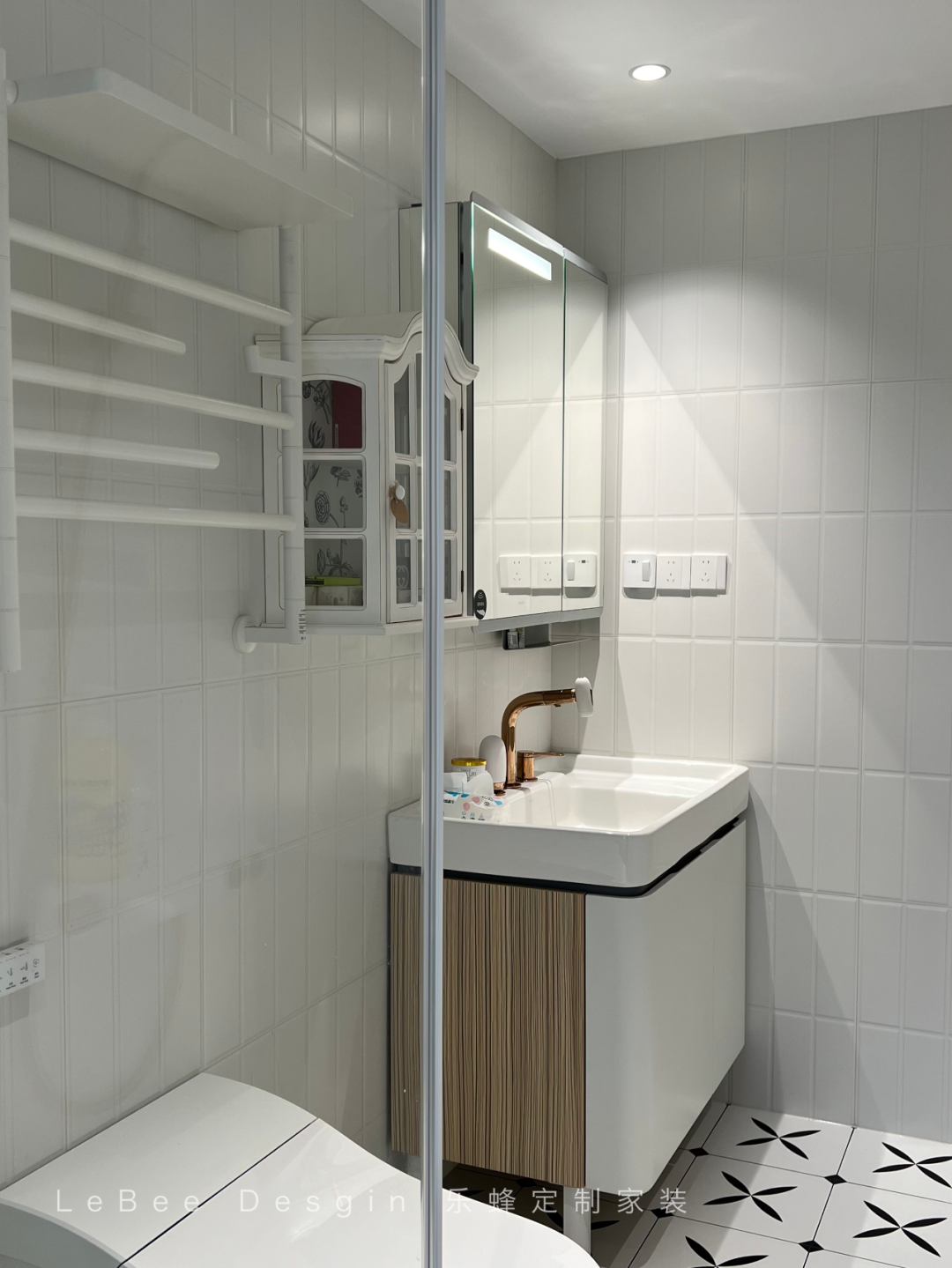主衛:干濕三分離,水磨石墻地一體+米白色五金,復古又易打理。壁掛馬桶上方設計米白色置物架,香薰綠植增添生活情調。