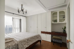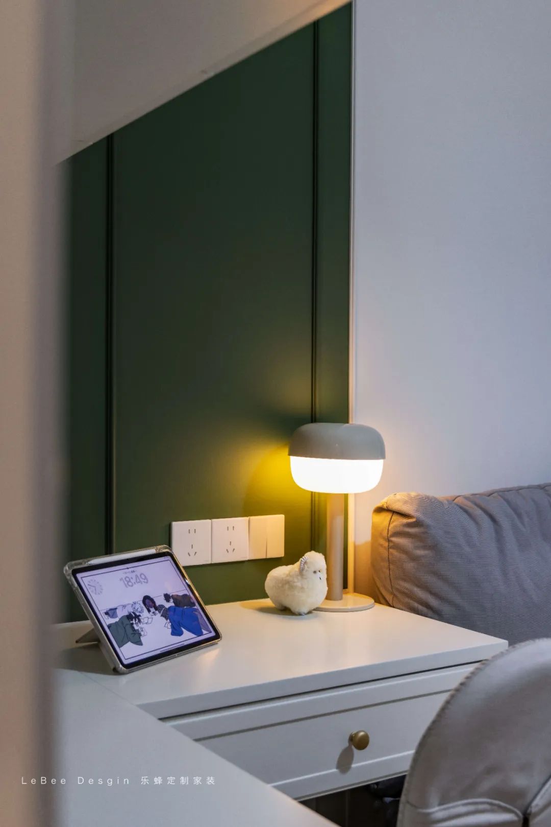 主臥套房:復古格調與舒適主義的平衡背景墻采用法式線條+分色設計,胡桃木與米白碰撞出高級感。床頭柜+復古燈,細節處彰顯中古美學。