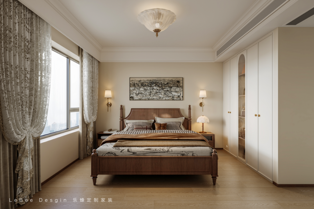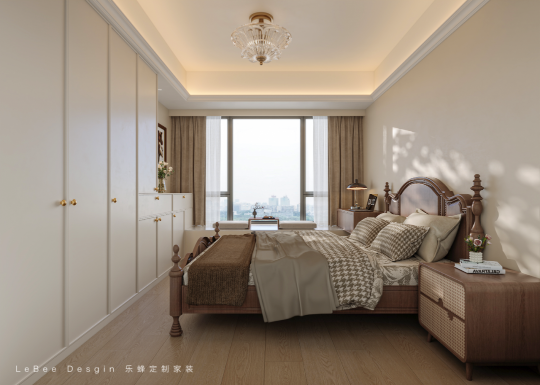美拉德色系家具搭配,塑造了格調滿滿的美式復古感,臥室墻面統一使用杏仁色墻面色調優雅而沉穩,時光在溫柔中緩慢流淌。