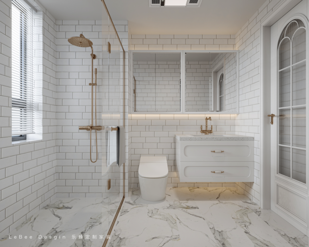 濕區優化:淋浴區采用長虹玻璃隔斷,搭配復古花灑,兼顧隱私與顏值。