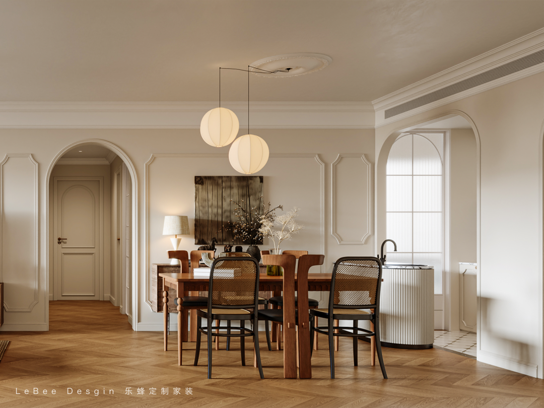 餐廳與客廳相連,并采用圓形吊頂優雅藝術且讓空間更具整體性經典復古黃銅吊頂與實木餐桌椅搭配黑色法式櫥柜讓餐廳擁有老電影般的質感。