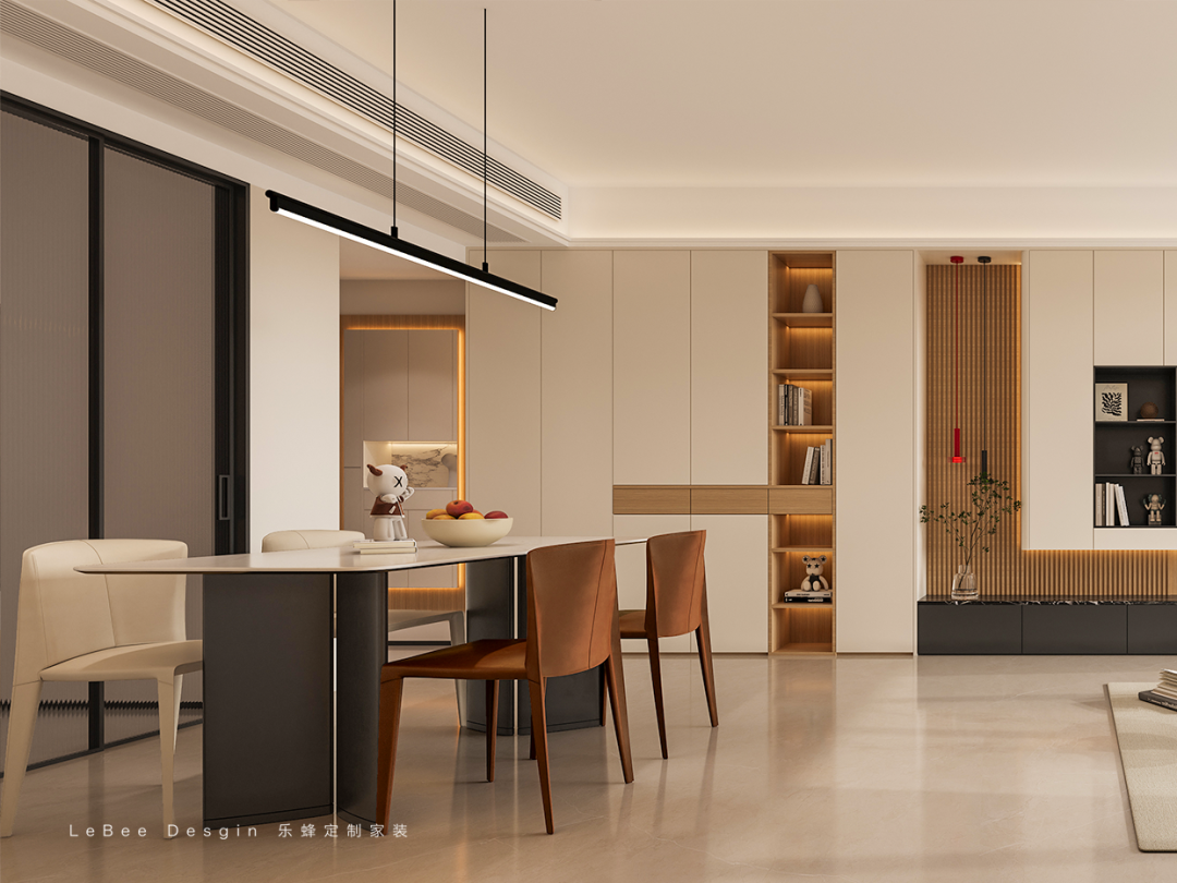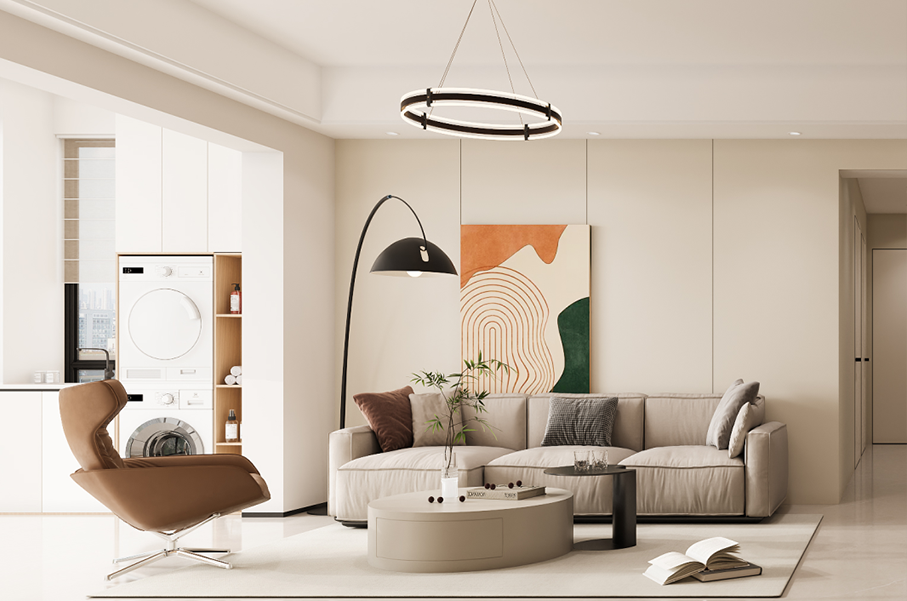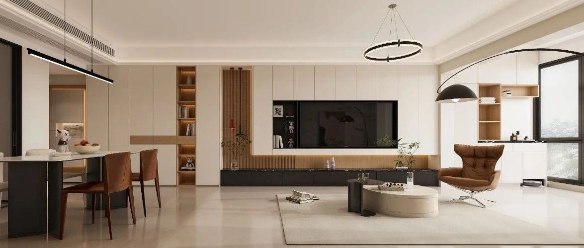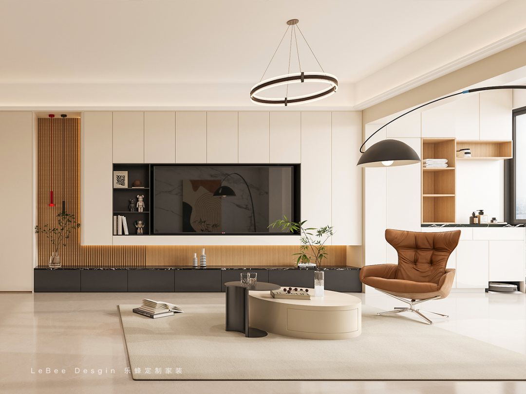 - 客廳區域沙發:低矮布藝沙發,搭配原木茶幾,簡約舒適。電視墻:定制米白色電視柜,兼具收納與展示功能。燈光:無主燈設計,筒燈+落地燈組合,營造層次感。