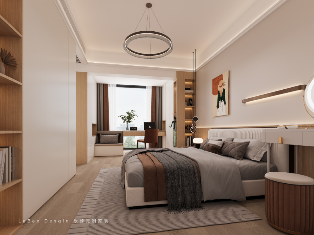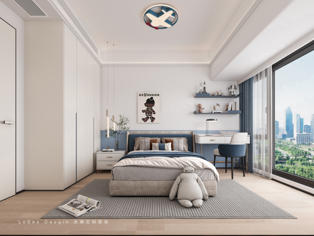 (2)書桌+衣柜靠墻設計書桌,搭配開放式書架,方便學習。書桌上方設計洞洞板,收納文具和小物件。定制米白色衣柜,內部設計合理分區。