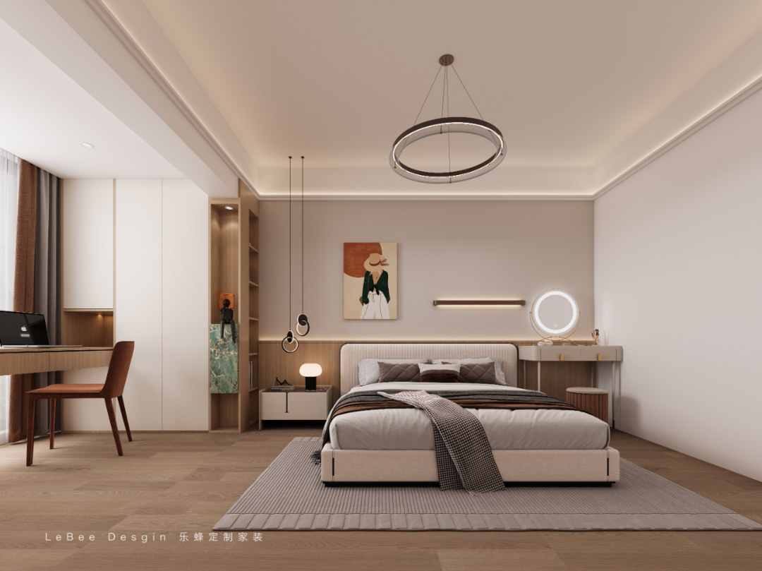 - 主臥效果圖 - 主臥設計以舒適為主,原木元素與柔和的色調營造出溫馨氛圍。