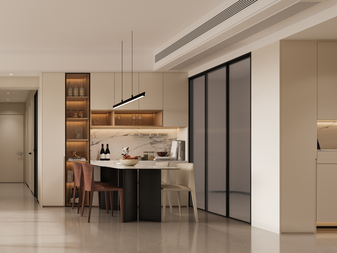 設計亮點:廚房與餐廳之間用玻璃移門隔斷,既隔絕油煙又不影響采光。墻面采用防油污材質,方便清潔。