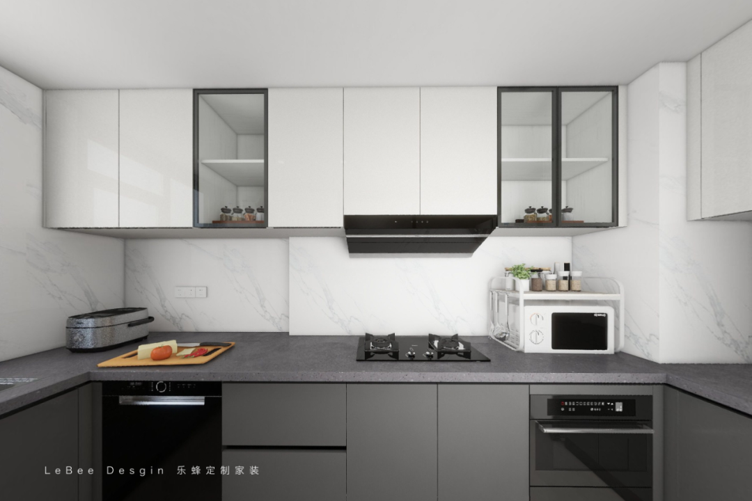 櫥柜白色櫥柜搭配灰色臺面,清新自然。吊柜+地柜組合,滿足廚房收納需求。