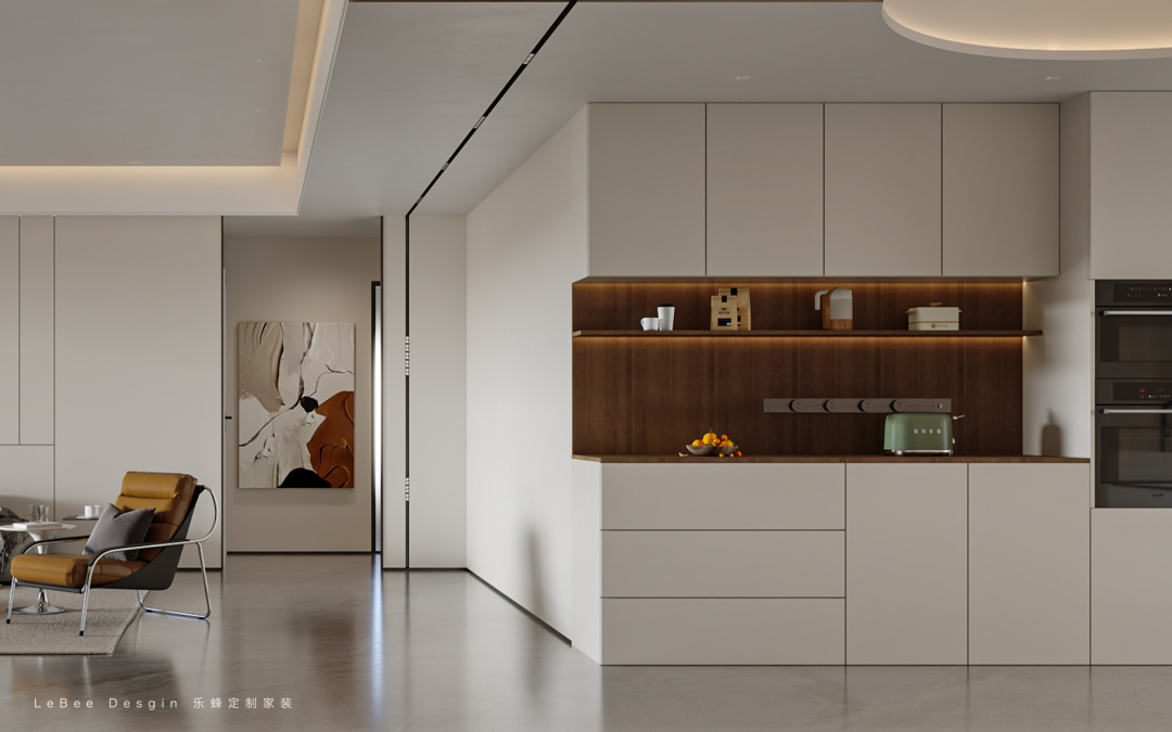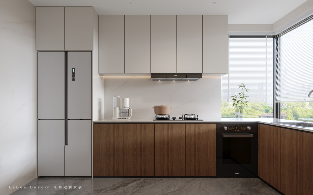 廚房呈U型布局,有足夠的操作空間;白色的吊柜加上胡桃木色地柜,搭配了白色臺面,自然過渡。家電內嵌,完美利用空間同時也不顯雜亂。