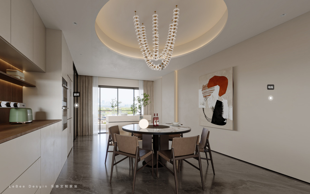 客餐廳一體設計,餐廳采用簡單低調的設計,設置白色和胡桃木色的上下餐邊柜,滿足收納需求。