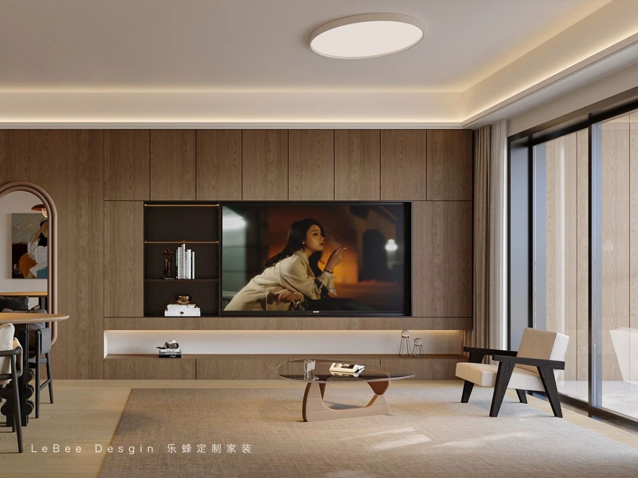 電視背景墻整墻定制柜以深胡桃木色為主基調,采用“二八原則”設計——80%封閉柜隱藏生活雜物,20%開放格陳列屋主收藏的中古擺件與藝術書籍。