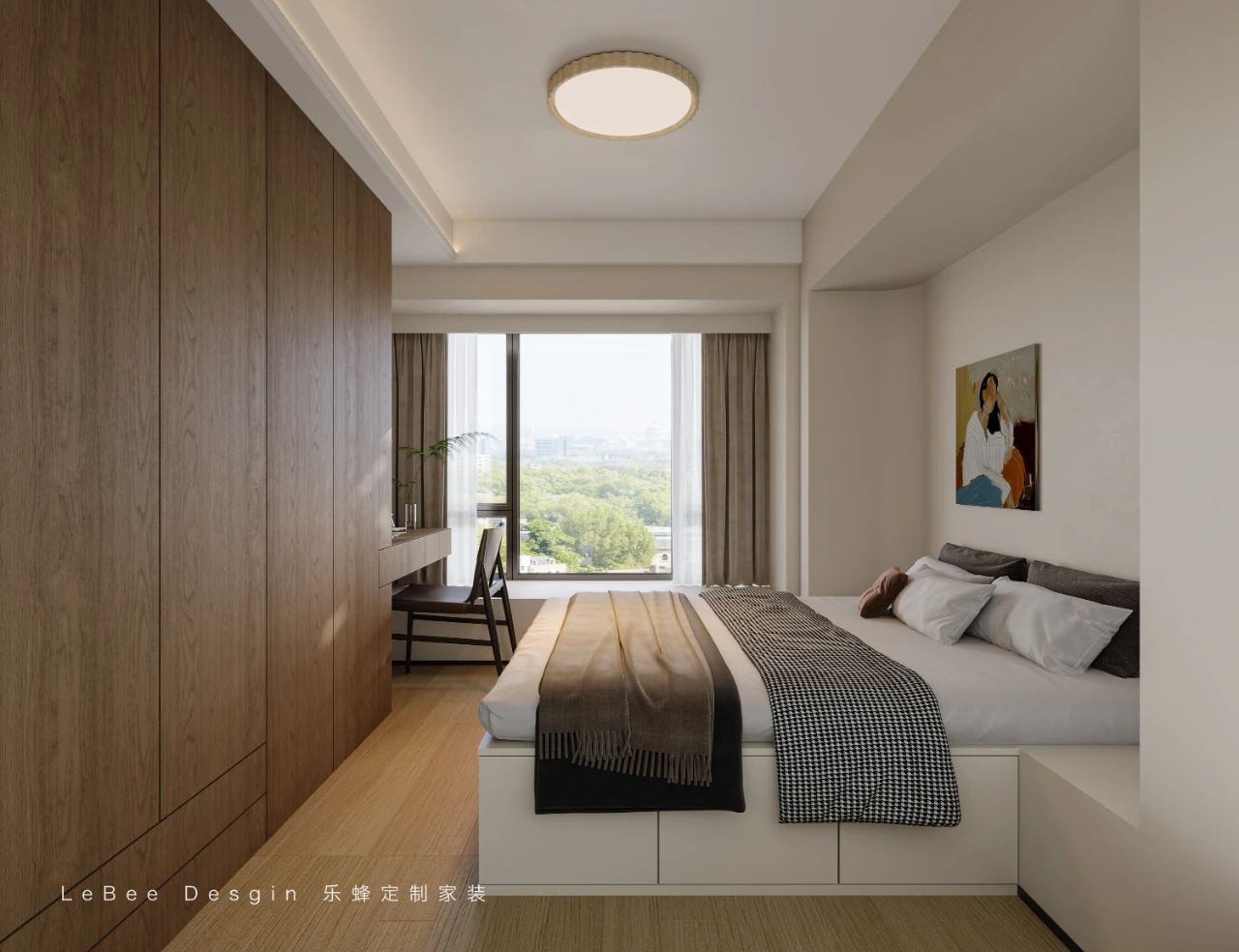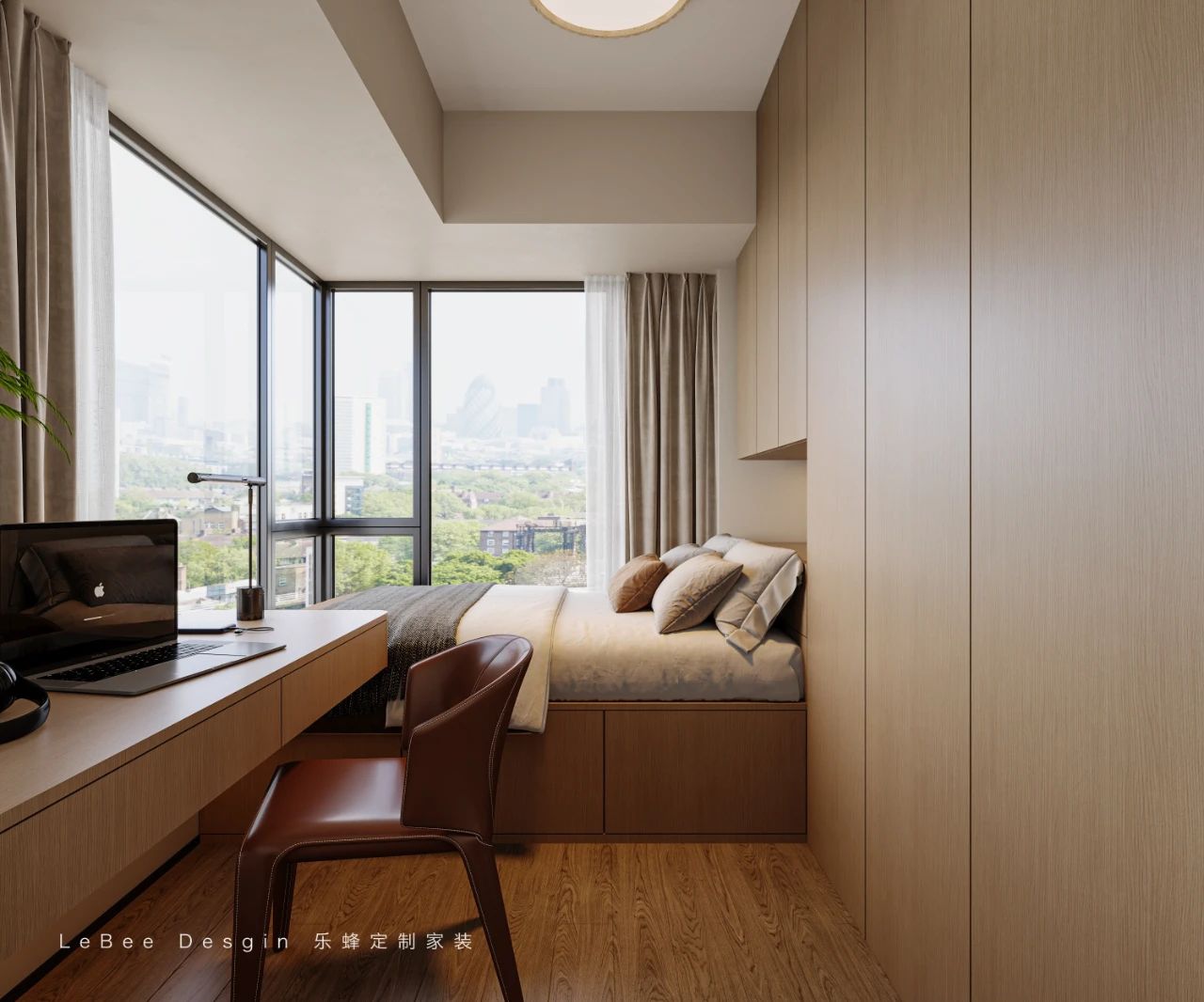 次臥通過定制設計實現“睡眠+收納+辦公”三重功能。