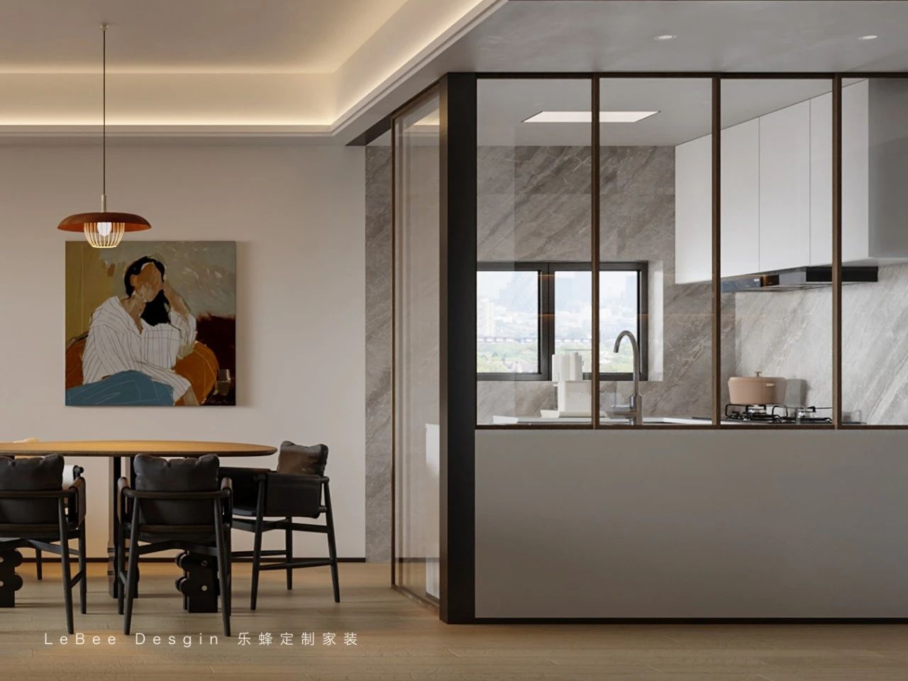 廚房以黑框長虹玻璃移門作為柔性隔斷,門框寬度僅3cm,極致窄邊設計讓空間更顯通透。移門可180度平開,爆炒時閉合阻隔油煙,日常打開則與客餐廳連為一體,主婦烹飪時亦可與家人互動。