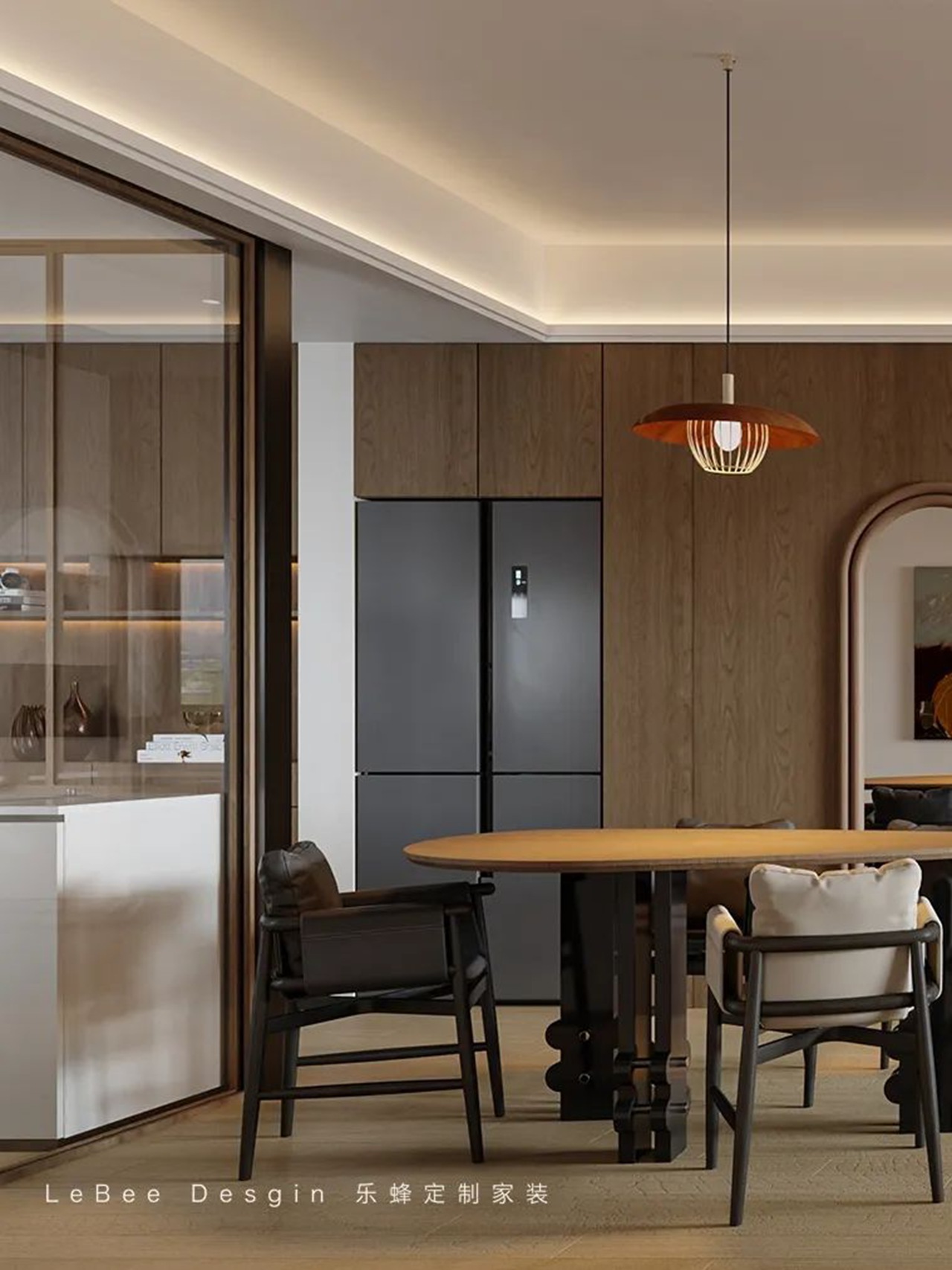 開放格內嵌3500K暖光燈帶,光線漫反射在啞光柜體上,營造出博物館般的靜謐氛圍。右側柜體預留嵌入式冰箱位,與廚房形成“取-洗-烹”黃金三角動線,下廚效率倍增。