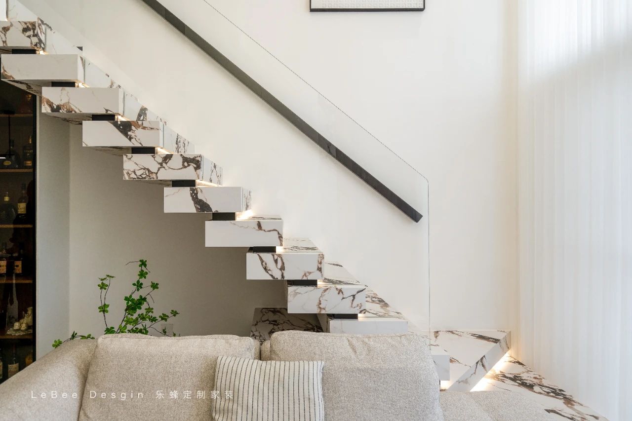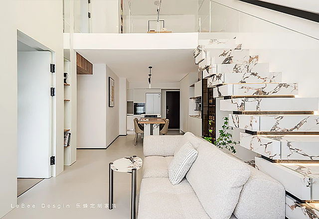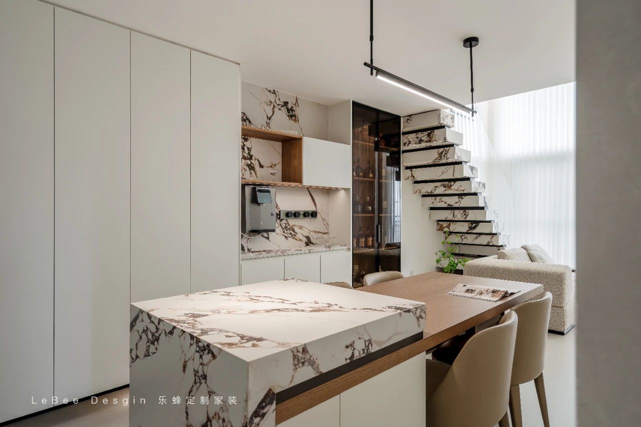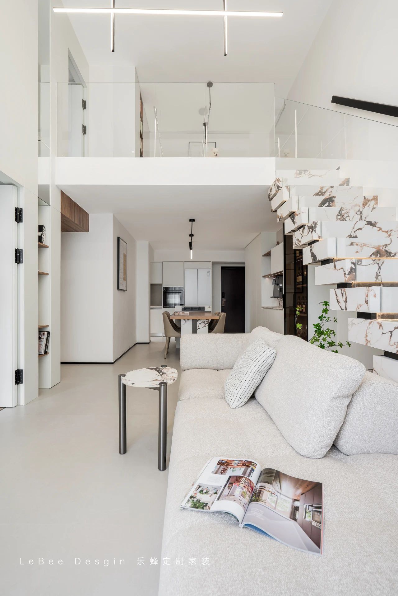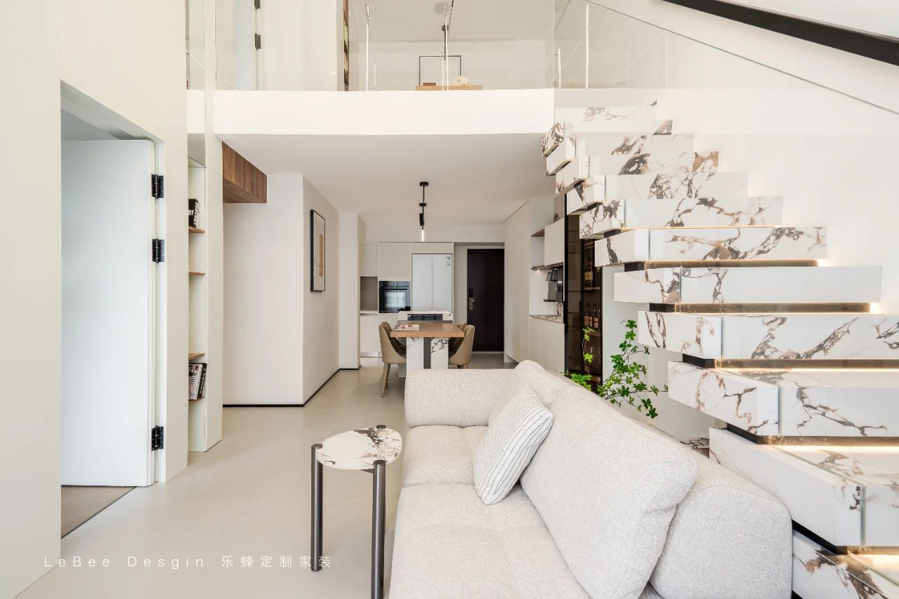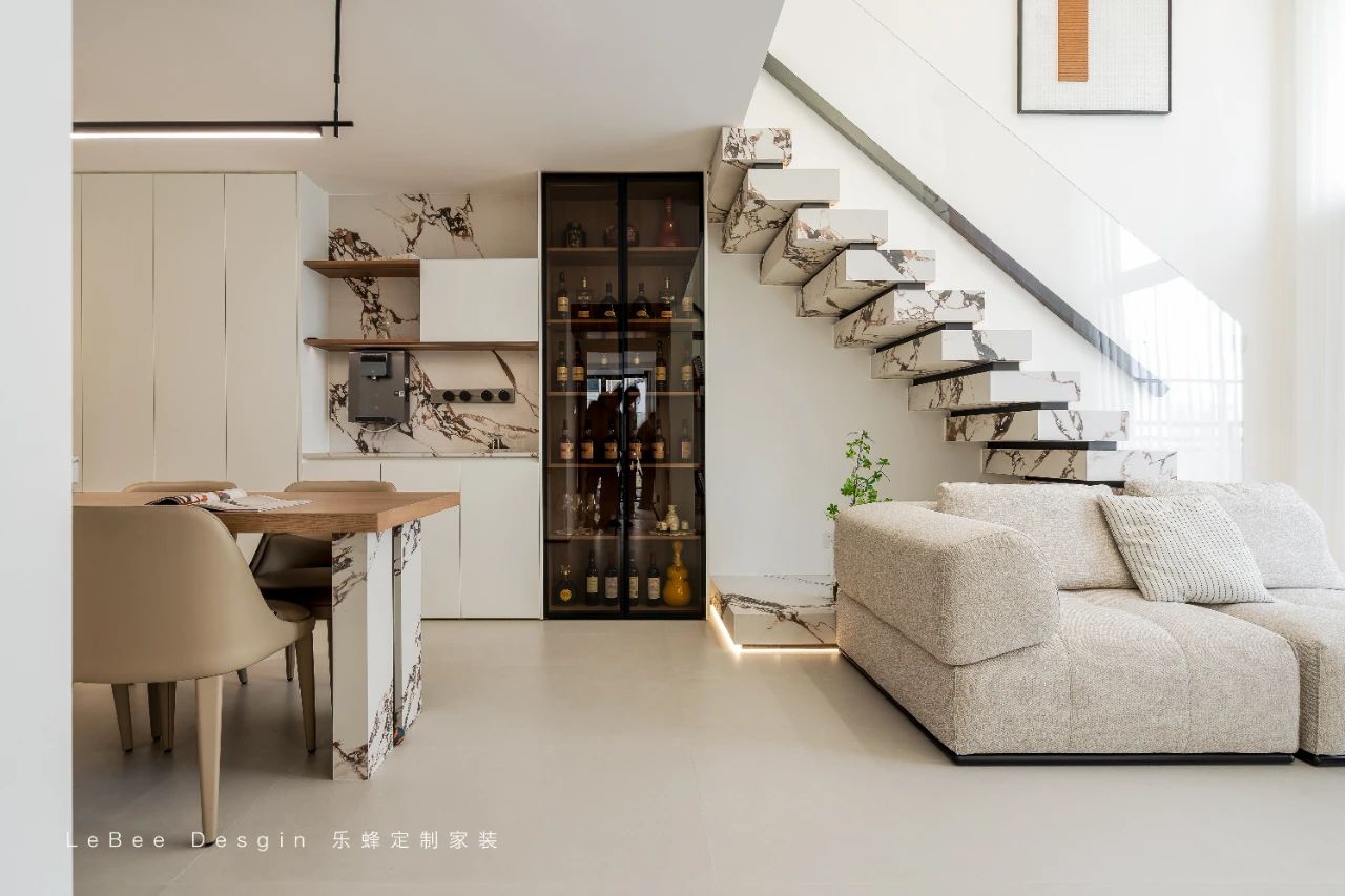 羅湖蓮塘的靜謐綠洲——合正錦園,一套150㎡復(fù)式空間以現(xiàn)代簡約風(fēng)煥發(fā)新生。 設(shè)計(jì)師通過極簡線條、天然材質(zhì)與光影互動,將層高優(yōu)勢與功能需求完美結(jié)合,打造出既開放又私密、既實(shí)用又充滿藝術(shù)感的都市居所。 清晨陽光穿透落地窗灑在亞麻窗簾上的光影、懸浮樓梯踏步亮起的暖黃燈帶、島臺咖啡機(jī)啟動時的低鳴,共同構(gòu)建出快節(jié)奏都市中獨(dú)有的慢生活儀式感。