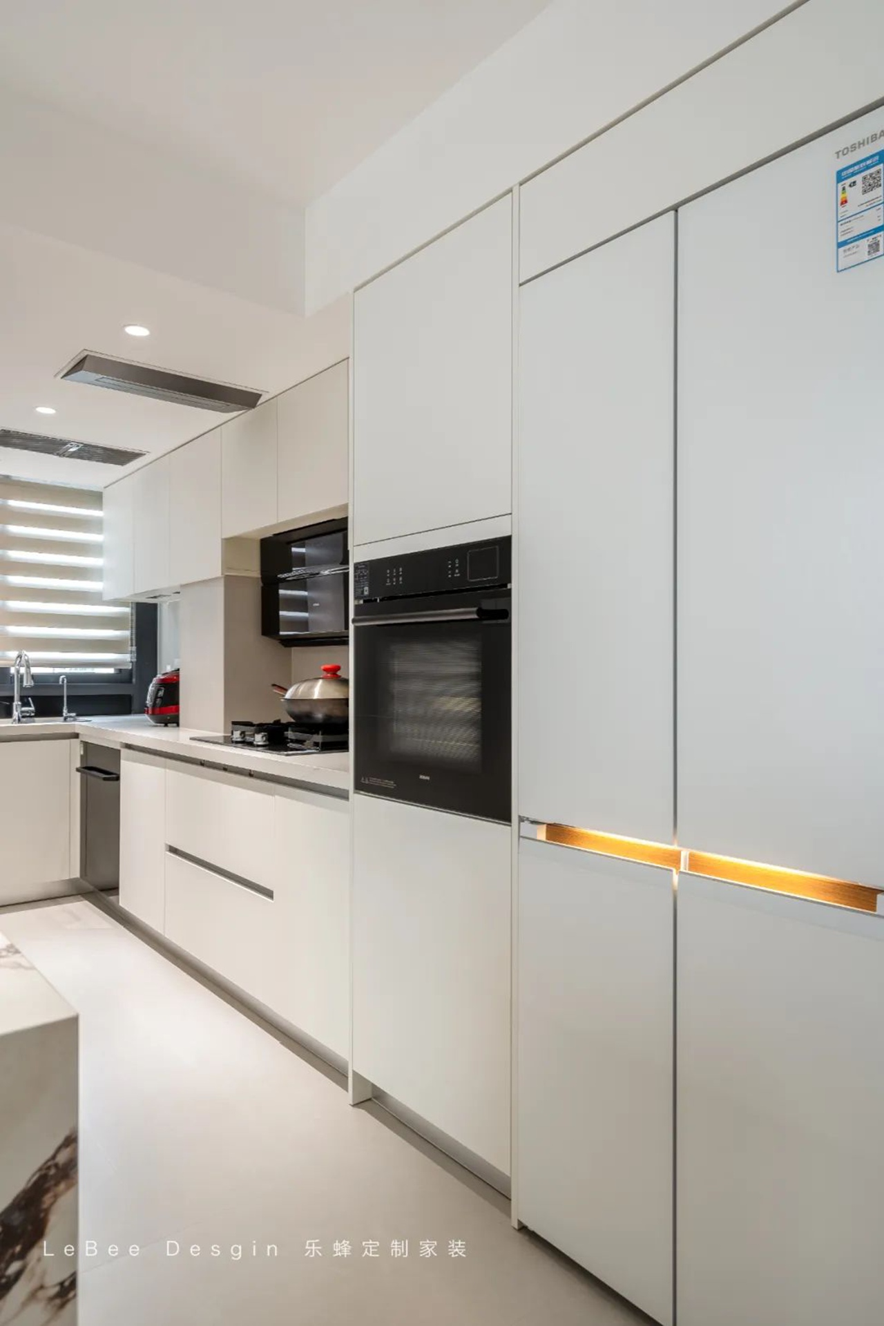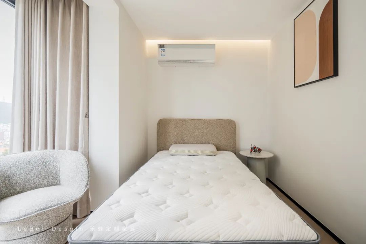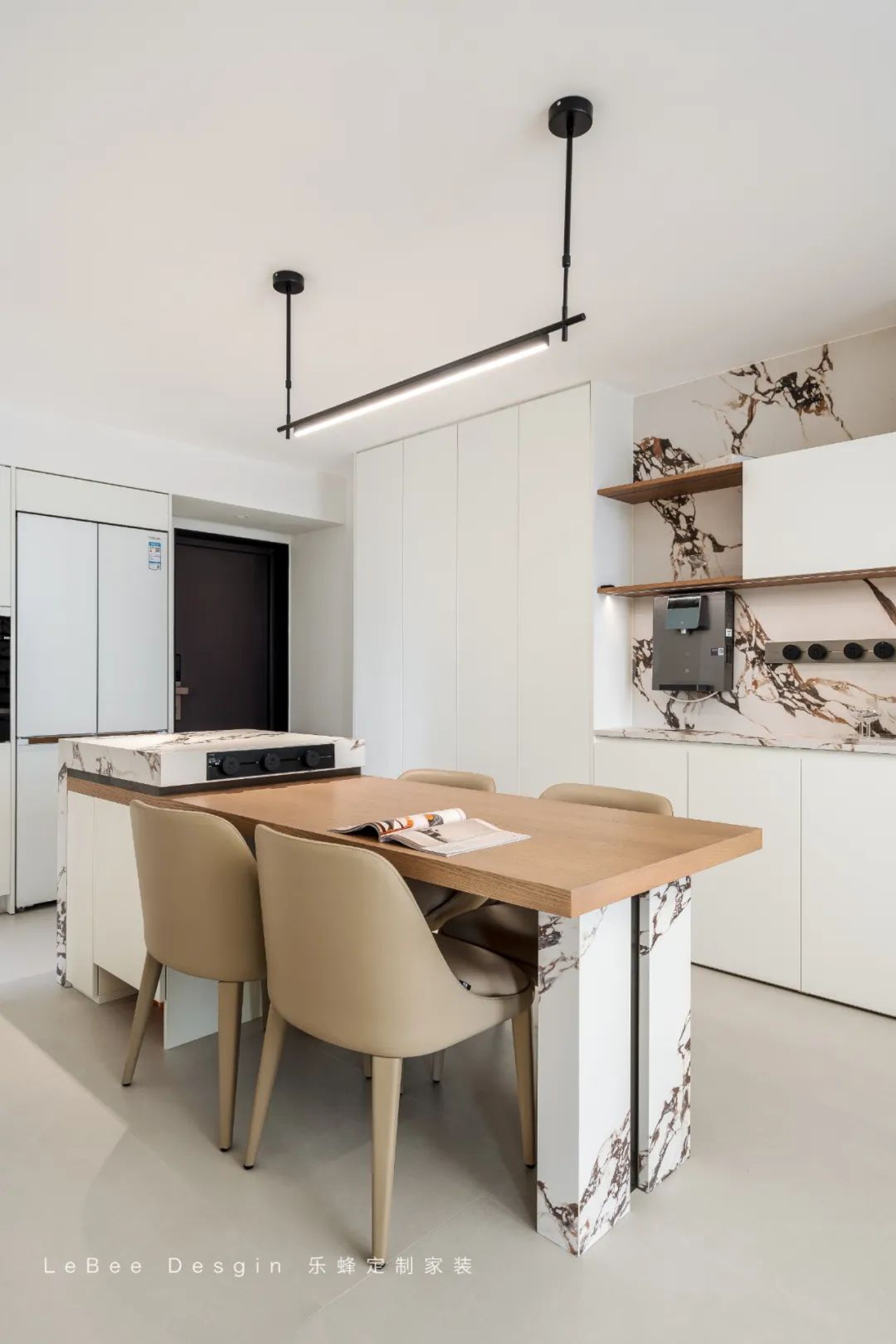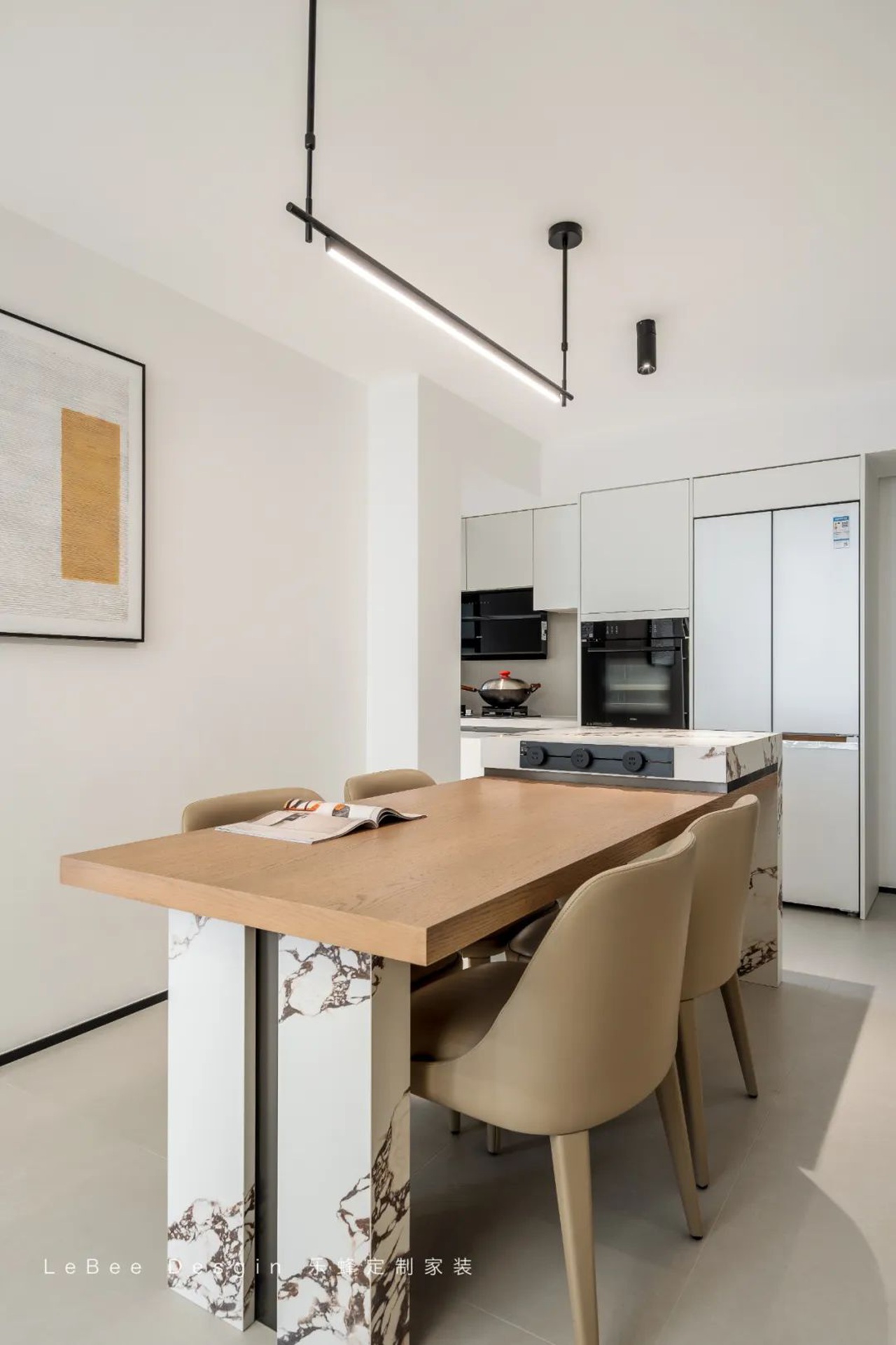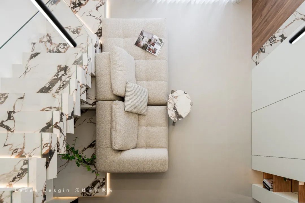 羅湖蓮塘的靜謐綠洲——合正錦園,一套150㎡復(fù)式空間以現(xiàn)代簡約風(fēng)煥發(fā)新生。 設(shè)計(jì)師通過極簡線條、天然材質(zhì)與光影互動,將層高優(yōu)勢與功能需求完美結(jié)合,打造出既開放又私密、既實(shí)用又充滿藝術(shù)感的都市居所。 清晨陽光穿透落地窗灑在亞麻窗簾上的光影、懸浮樓梯踏步亮起的暖黃燈帶、島臺咖啡機(jī)啟動時的低鳴,共同構(gòu)建出快節(jié)奏都市中獨(dú)有的慢生活儀式感。