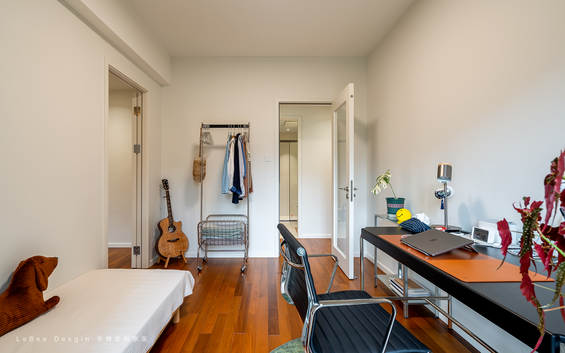 房間功能多樣,有書桌(搭配辦公椅、綠植、小物件)、休息區(床及抱枕),大推拉門引入窗外景色,營造舒適復合空間!