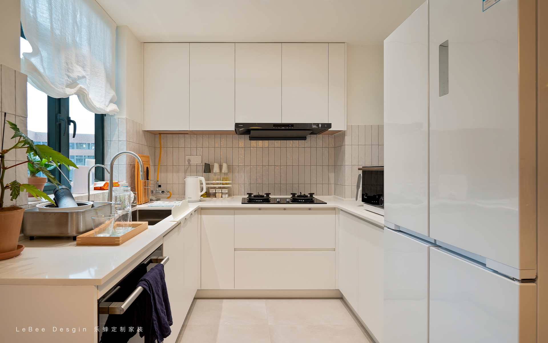 以白色為主色調,呈現出簡潔、明亮的視覺效果 。白色櫥柜提供充足收納